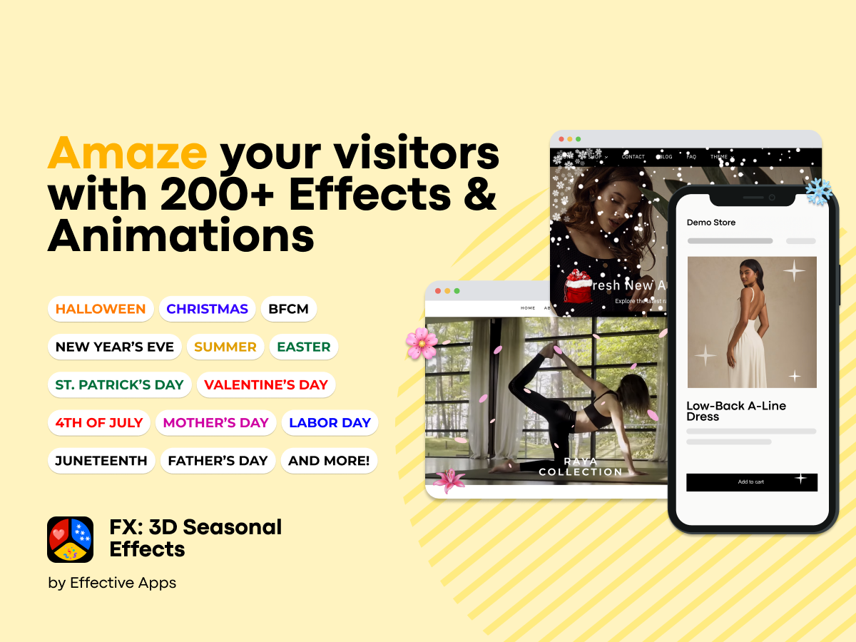 Transform your website into a celebration hub with stunning 3D falling effects, playful animations, and decorative designs for every holiday, sales event, or occasion. Instantly grab attention, delight visitors, and boost sales with seasonal flair.