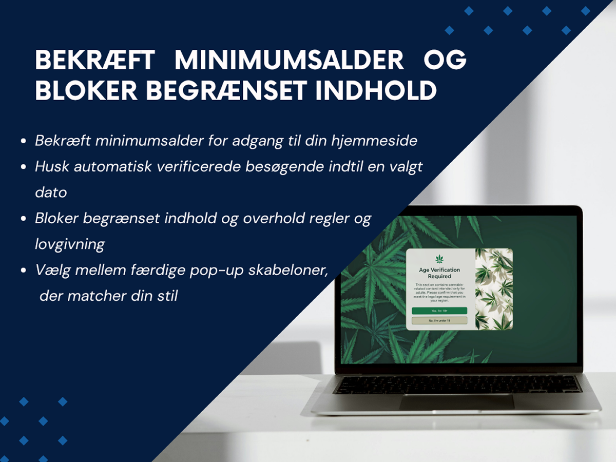 Sørg for, at din hjemmeside begrænser adgang til aldersfølsomt indhold med en intuitiv popup til aldersbekræftelse. Indstil aldersgrænser som 18+, 21+ eller efter dine behov, og overhold nemt lovgivningen. Vælg mellem færdige skabeloner, der matcher din stil, og tilføj dit logo for et personligt udtryk.