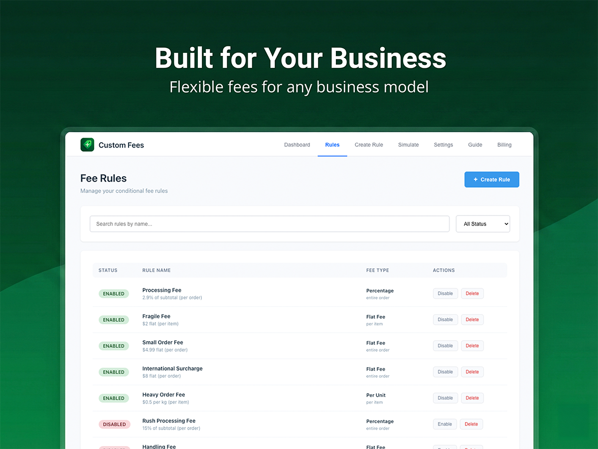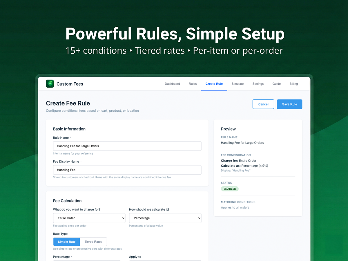 Custom Fees lets you add any type of additional charge to your store's checkout without writing a single line of code. From payment processing costs and handling fees to international surcharges and weight-based charges, you can automatically apply the right fee to the right order every time. Set up your rules using fixed amounts, percentages, or weight-based calculations, and fine-tune exactly when they apply with flexible conditions. There's no limit to how many rules you can create, so your fee structure can be as simple or detailed as your business needs. Pricing is straightforward: the free tier resets every month, you only pay a percentage of the fees you collect, and your rate goes down as your volume grows. Your customers see transparent, clearly labeled fees right at checkout. Stop absorbing hidden costs and start recovering your margins on every order.