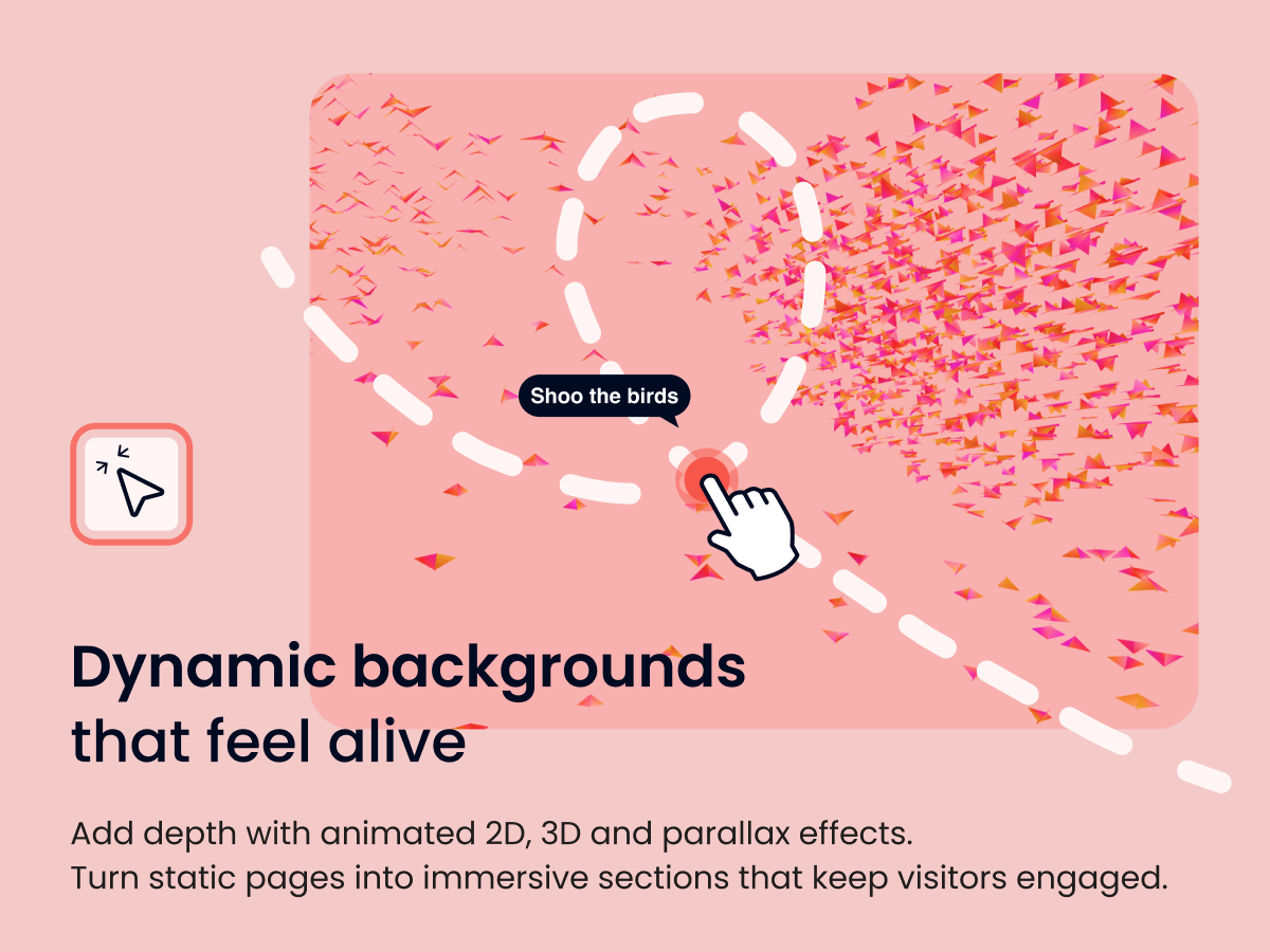 Interactive Backgrounds: Add depth with immersive 2D & 3D backgrounds, parallax motion, gradients, and hover-based effects like Zoom, Pan, and Mouse Follow