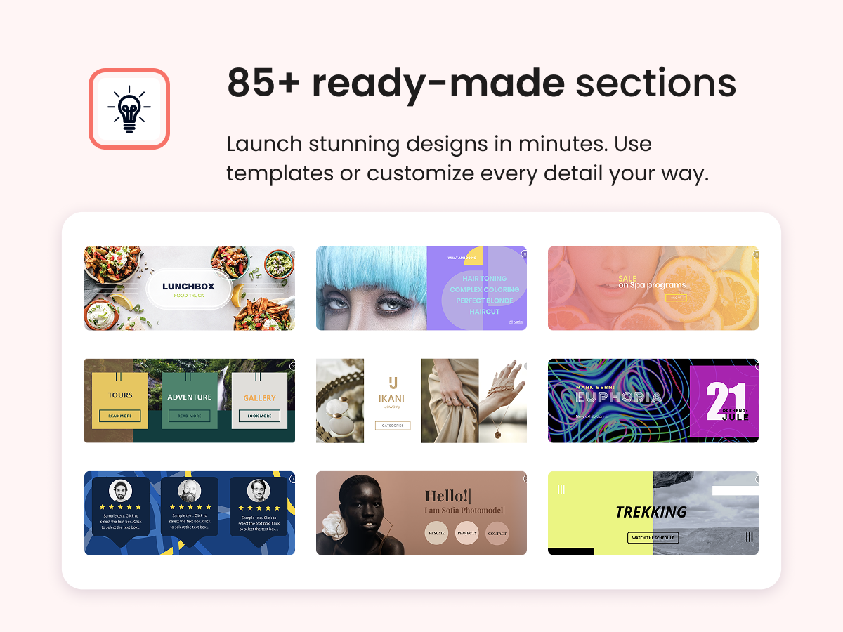 Use ready-made templates to save time or build from scratch for a tailored experience. Every section is fully responsive and optimized for mobile and desktop.