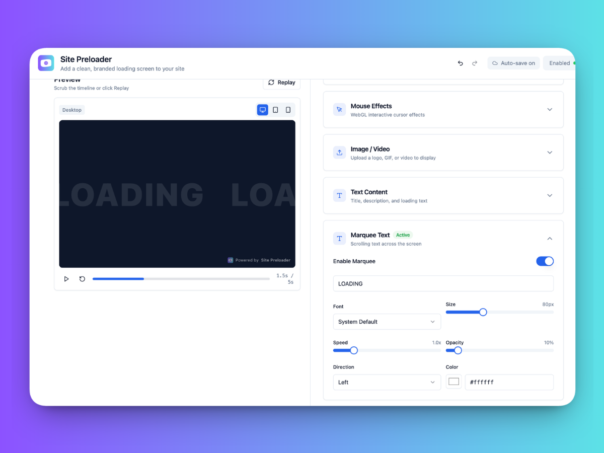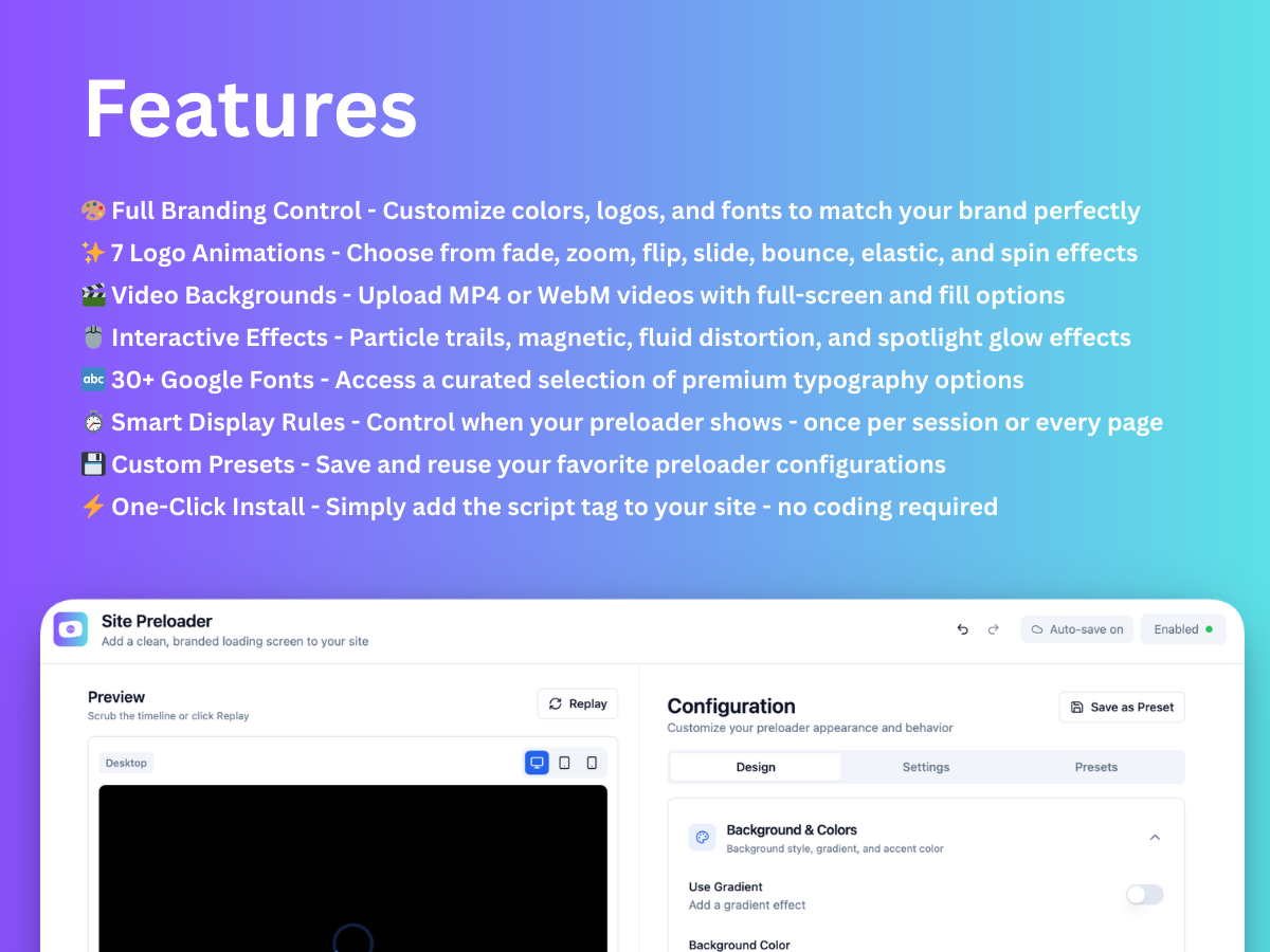 Customize every detail using an intuitive dashboard with live preview. Upload your logo or video, style text with 30+ Google Fonts, create animated entrances, and design a loading screen that perfectly matches your brand - all with zero coding required.