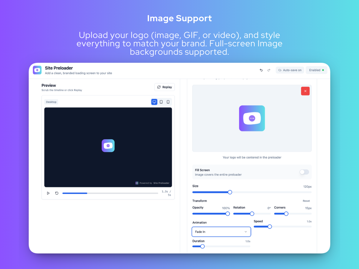 Full Customization - Choose your brand colors, gradients, logos, images, or videos to create a fully branded loading experience for your site