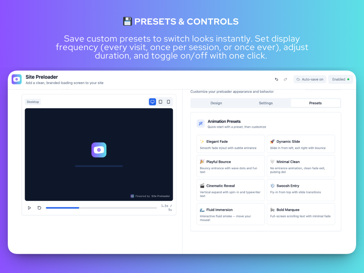 Smart Display Controls - Show on every visit, once per session, or once ever. Save reusable presets and switch designs instantly