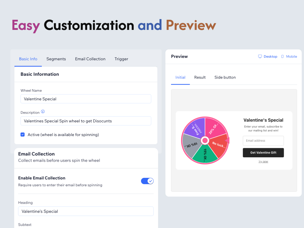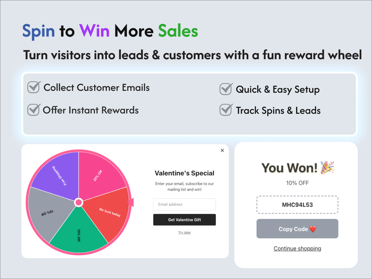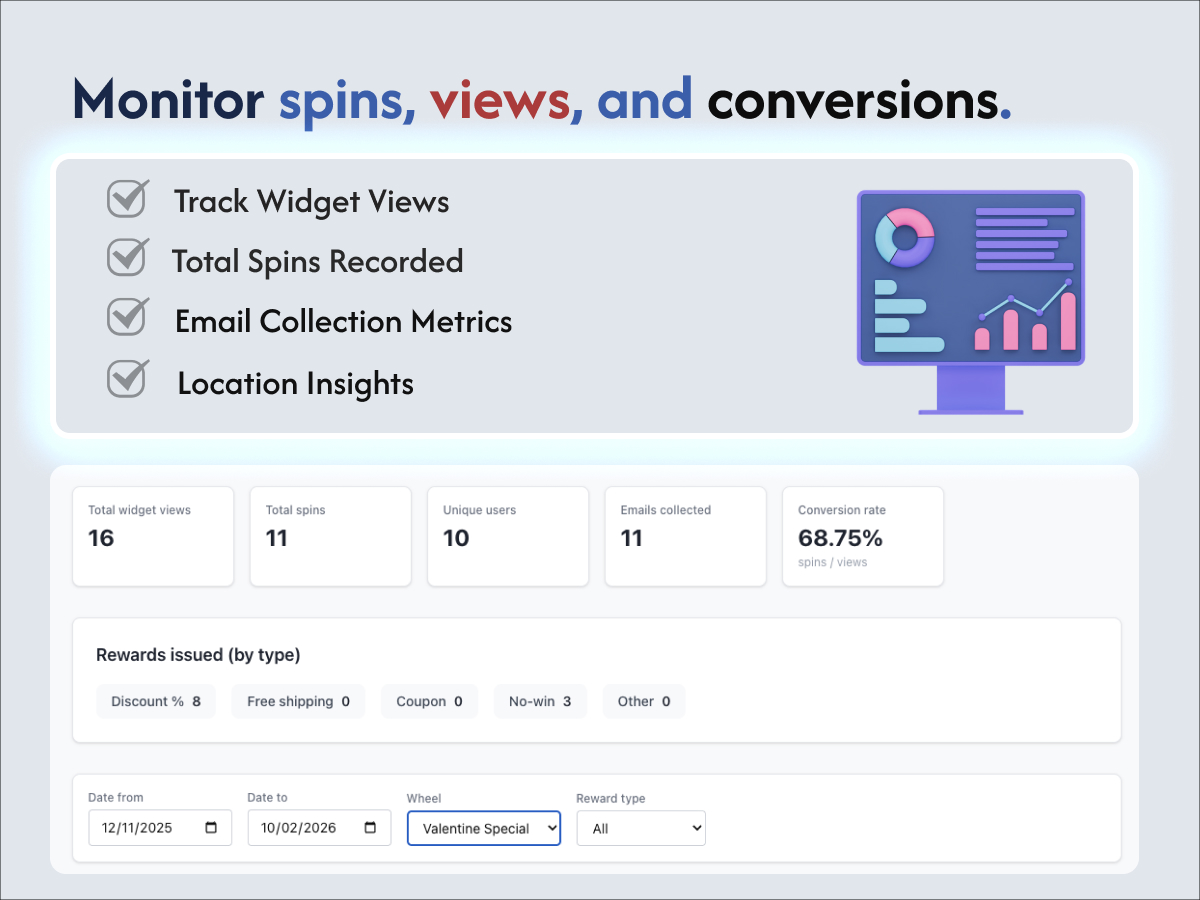 Engage your users and boost interaction with a fun and interactive Spin Wheel. Create customized wheels with prizes, discounts, or rewards to increase sales, loyalty, and user engagement. Easy to set up, visually appealing, and fully configurable, the app lets you spin excitement into your store while tracking results in real time. Perfect for promotions, giveaways, or gamified shopping experiences.